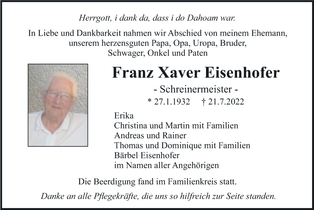 Hier finden Sie alle Traueranzeigen aus der Zeitung, die bisher für Franz Xaver Eisenhofer erschienen sind. Weitere Traueranzeigen, die in der Zeitung erscheinen, werden hier ebenfalls aufgelistet
