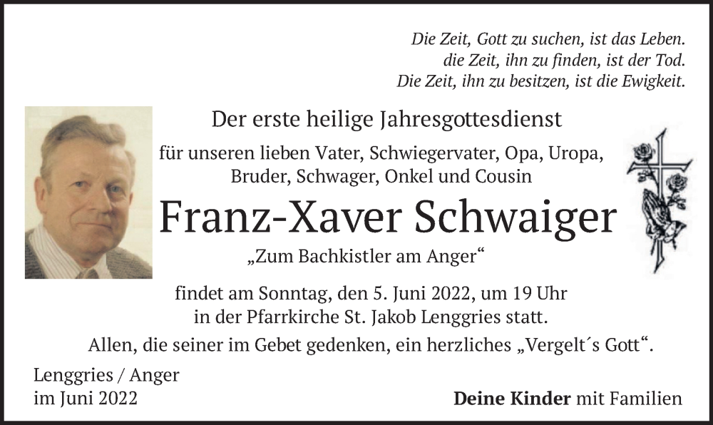 Hier finden Sie alle Traueranzeigen aus der Zeitung, die bisher für Franz-Xaver Schwaiger erschienen sind. Weitere Traueranzeigen, die in der Zeitung erscheinen, werden hier ebenfalls aufgelistet