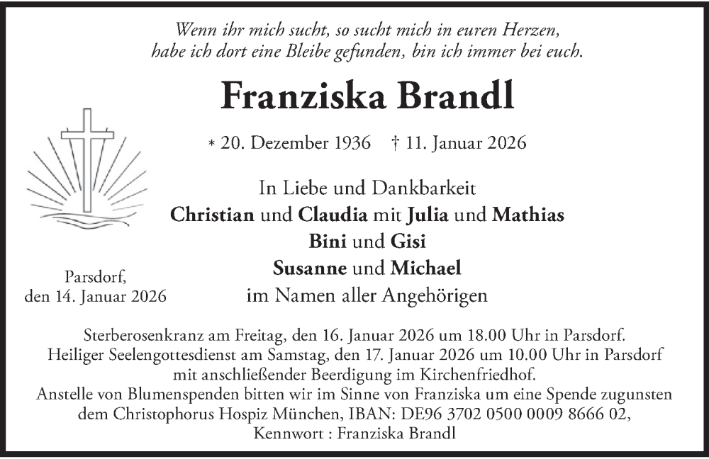 Hier finden Sie alle Traueranzeigen aus der Zeitung, die bisher für Franziska Brandl erschienen sind. Weitere Traueranzeigen, die in der Zeitung erscheinen, werden hier ebenfalls aufgelistet