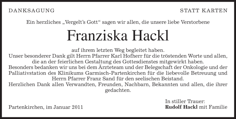 Hier finden Sie alle Traueranzeigen aus der Zeitung, die bisher für Franziska Hackl erschienen sind. Weitere Traueranzeigen, die in der Zeitung erscheinen, werden hier ebenfalls aufgelistet