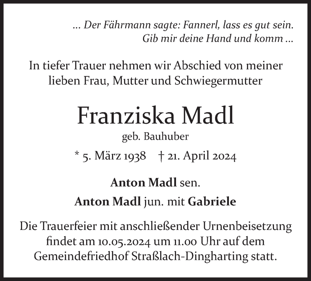 Hier finden Sie alle Traueranzeigen aus der Zeitung, die bisher für Franziska Madl erschienen sind. Weitere Traueranzeigen, die in der Zeitung erscheinen, werden hier ebenfalls aufgelistet
