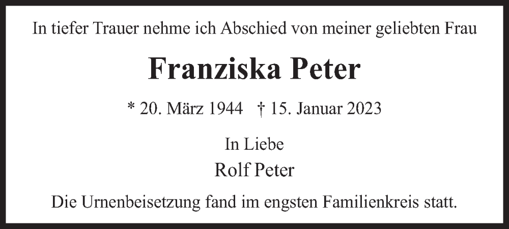 Hier finden Sie alle Traueranzeigen aus der Zeitung, die bisher für Franziska Peter erschienen sind. Weitere Traueranzeigen, die in der Zeitung erscheinen, werden hier ebenfalls aufgelistet