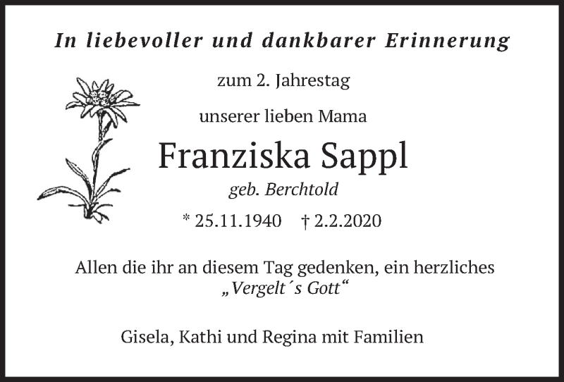 Hier finden Sie alle Traueranzeigen aus der Zeitung, die bisher für Franziska Sappl erschienen sind. Weitere Traueranzeigen, die in der Zeitung erscheinen, werden hier ebenfalls aufgelistet