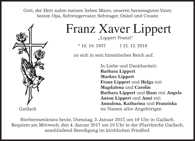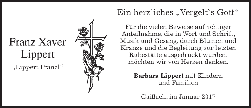 Hier finden Sie alle Traueranzeigen aus der Zeitung, die bisher für Franz Xaver Lippert erschienen sind. Weitere Traueranzeigen, die in der Zeitung erscheinen, werden hier ebenfalls aufgelistet