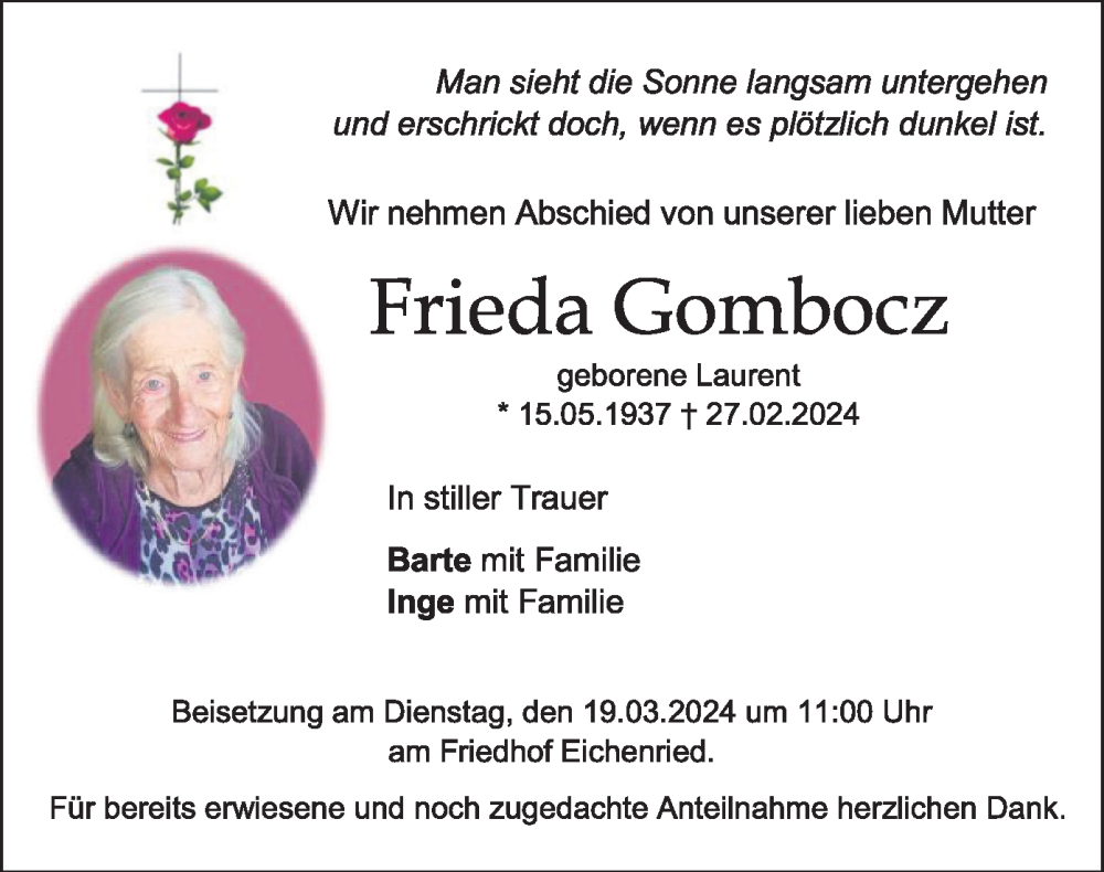 Hier finden Sie alle Traueranzeigen aus der Zeitung, die bisher für Frieda Gombocz erschienen sind. Weitere Traueranzeigen, die in der Zeitung erscheinen, werden hier ebenfalls aufgelistet