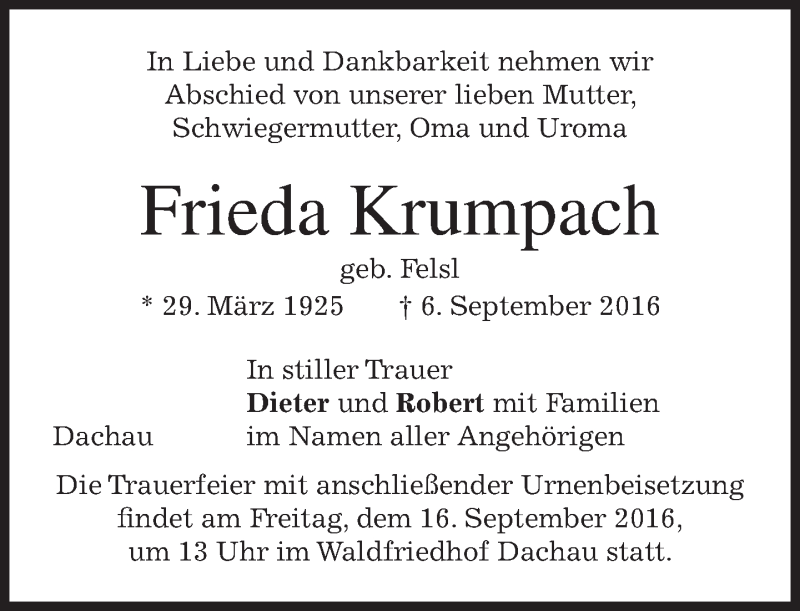 Hier finden Sie alle Traueranzeigen aus der Zeitung, die bisher für Frieda Krumpach erschienen sind. Weitere Traueranzeigen, die in der Zeitung erscheinen, werden hier ebenfalls aufgelistet
