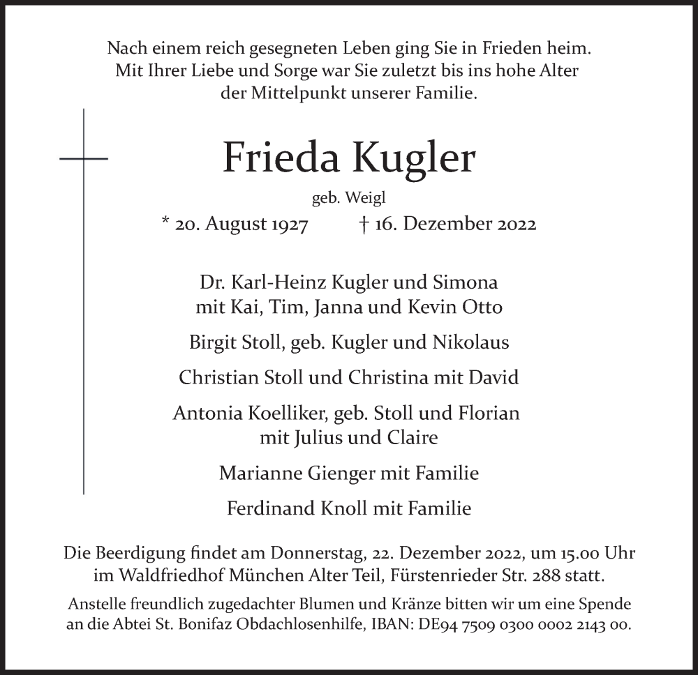 Hier finden Sie alle Traueranzeigen aus der Zeitung, die bisher für Frieda Kugler erschienen sind. Weitere Traueranzeigen, die in der Zeitung erscheinen, werden hier ebenfalls aufgelistet