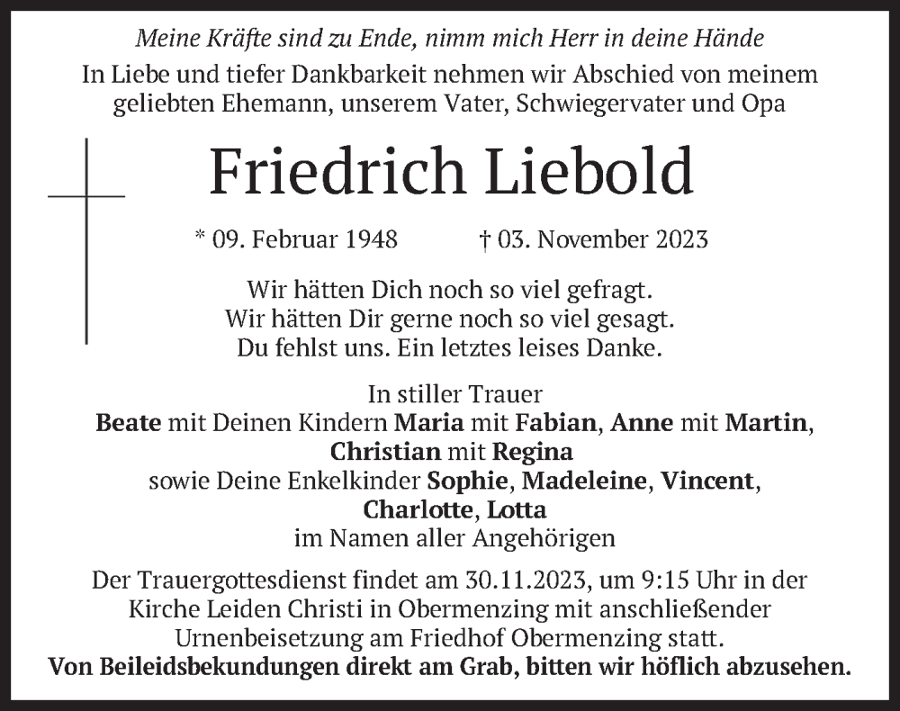 Hier finden Sie alle Traueranzeigen aus der Zeitung, die bisher für Friedrich Liebold erschienen sind. Weitere Traueranzeigen, die in der Zeitung erscheinen, werden hier ebenfalls aufgelistet