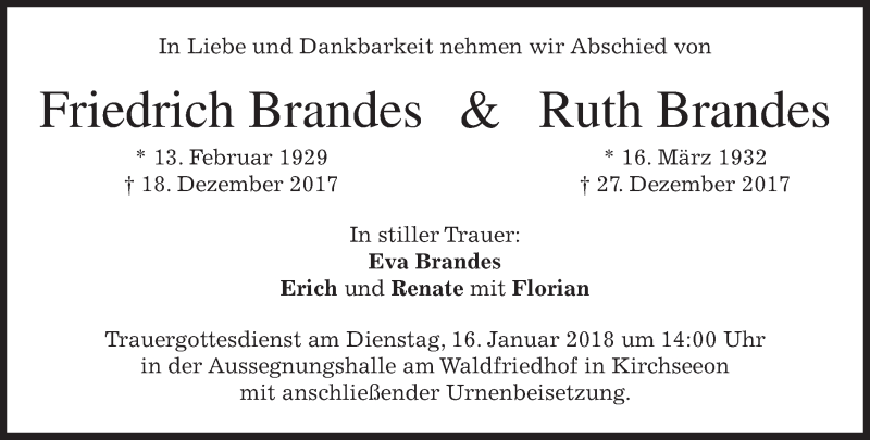 Hier finden Sie alle Traueranzeigen aus der Zeitung, die bisher für Friedrich und Ruth Brandes erschienen sind. Weitere Traueranzeigen, die in der Zeitung erscheinen, werden hier ebenfalls aufgelistet