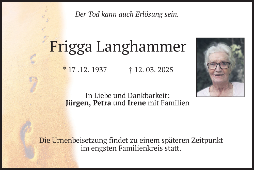 Hier finden Sie alle Traueranzeigen aus der Zeitung, die bisher für Frigga Langhammer erschienen sind. Weitere Traueranzeigen, die in der Zeitung erscheinen, werden hier ebenfalls aufgelistet