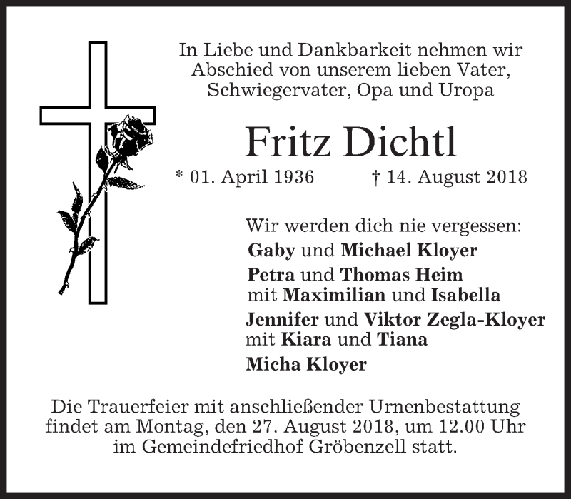 Hier finden Sie alle Traueranzeigen aus der Zeitung, die bisher für Fritz Dichtl erschienen sind. Weitere Traueranzeigen, die in der Zeitung erscheinen, werden hier ebenfalls aufgelistet