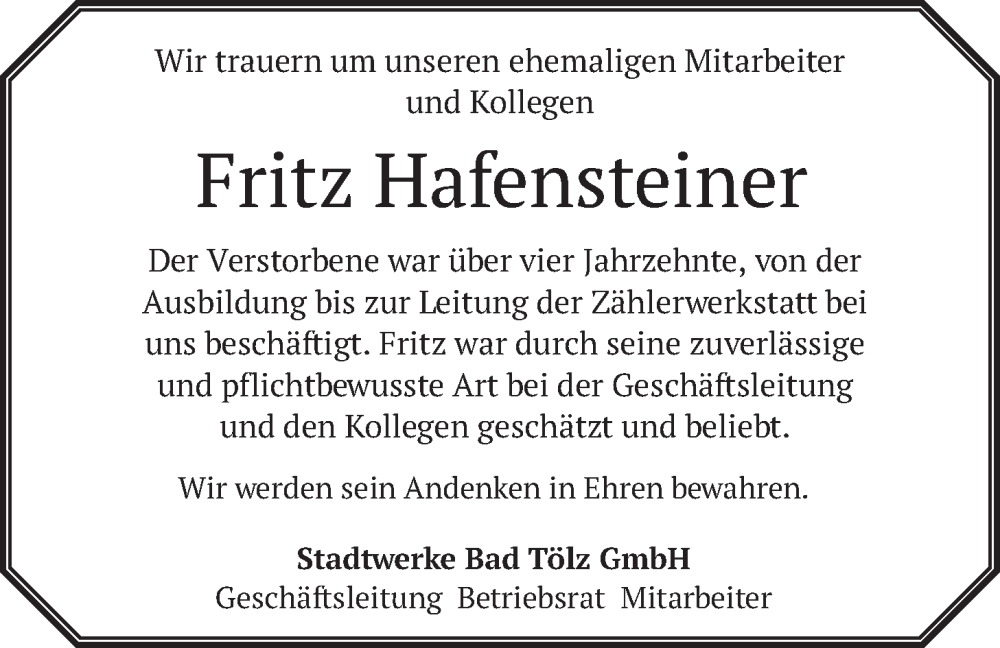 Hier finden Sie alle Traueranzeigen aus der Zeitung, die bisher für Fritz Hafensteiner erschienen sind. Weitere Traueranzeigen, die in der Zeitung erscheinen, werden hier ebenfalls aufgelistet