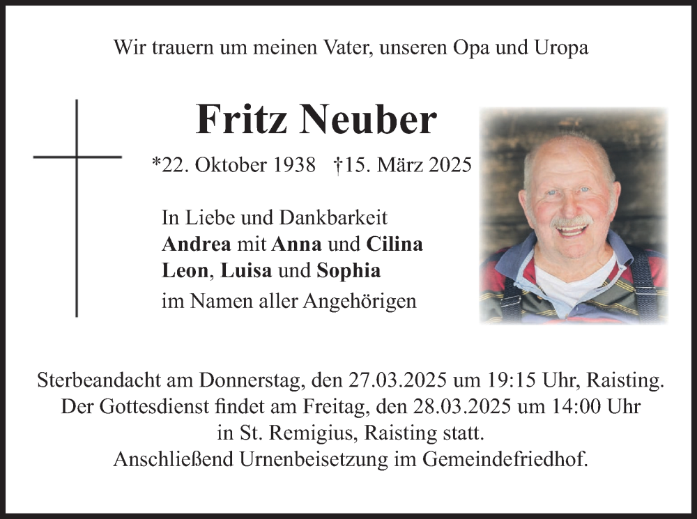 Hier finden Sie alle Traueranzeigen aus der Zeitung, die bisher für Fritz Neuber Neuber erschienen sind. Weitere Traueranzeigen, die in der Zeitung erscheinen, werden hier ebenfalls aufgelistet