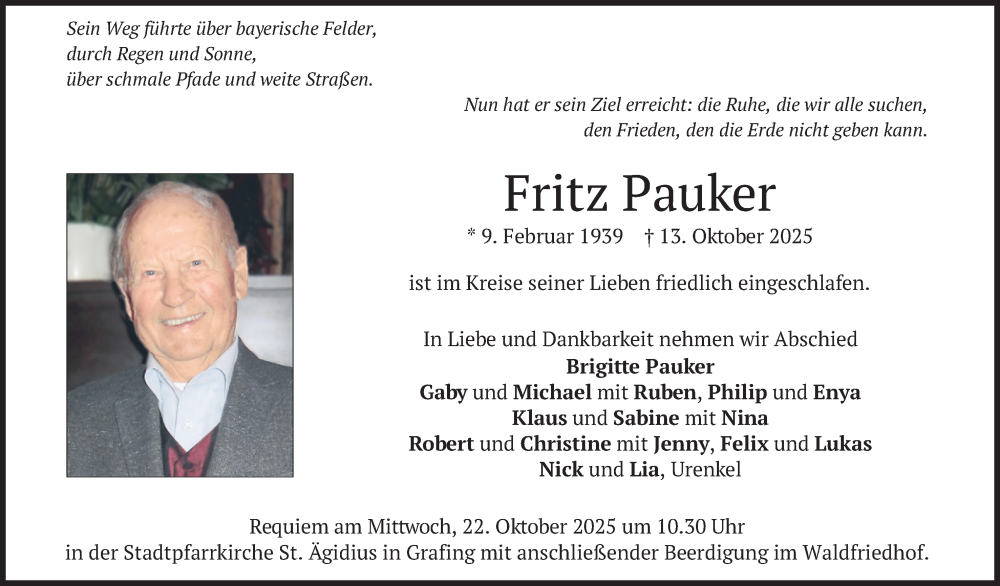 Hier finden Sie alle Traueranzeigen aus der Zeitung, die bisher für Fritz Pauker erschienen sind. Weitere Traueranzeigen, die in der Zeitung erscheinen, werden hier ebenfalls aufgelistet
