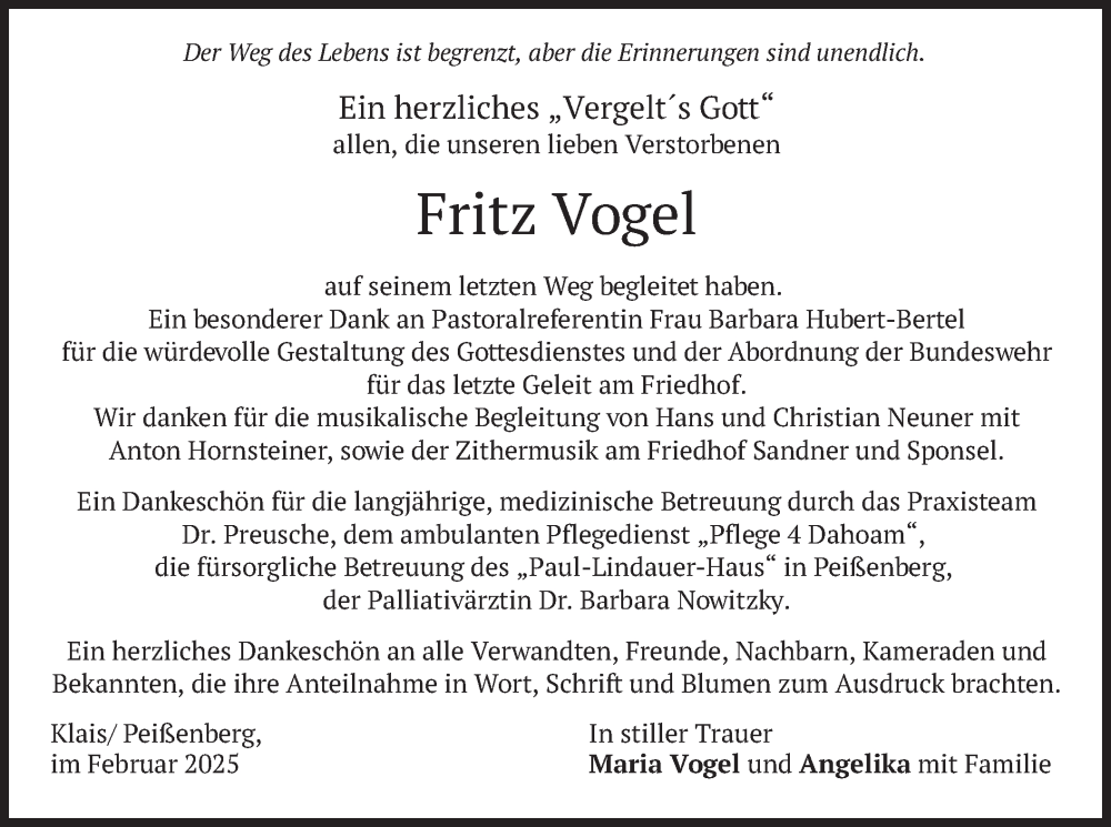 Hier finden Sie alle Traueranzeigen aus der Zeitung, die bisher für Fritz Vogel erschienen sind. Weitere Traueranzeigen, die in der Zeitung erscheinen, werden hier ebenfalls aufgelistet