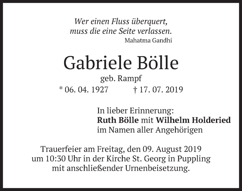 Hier finden Sie alle Traueranzeigen aus der Zeitung, die bisher für Gabriele Bölle erschienen sind. Weitere Traueranzeigen, die in der Zeitung erscheinen, werden hier ebenfalls aufgelistet