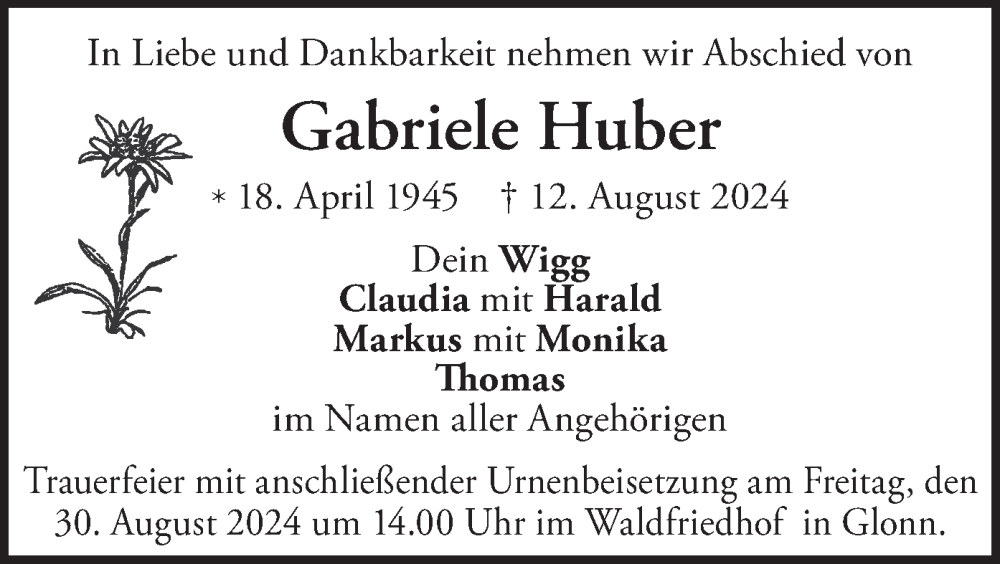 Hier finden Sie alle Traueranzeigen aus der Zeitung, die bisher für Gabriele Huber erschienen sind. Weitere Traueranzeigen, die in der Zeitung erscheinen, werden hier ebenfalls aufgelistet