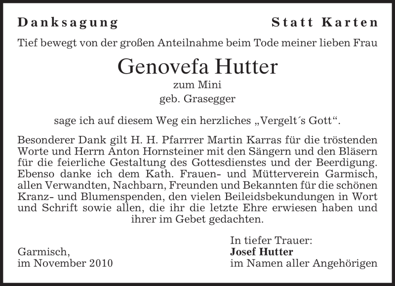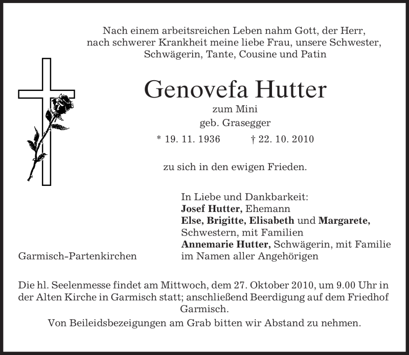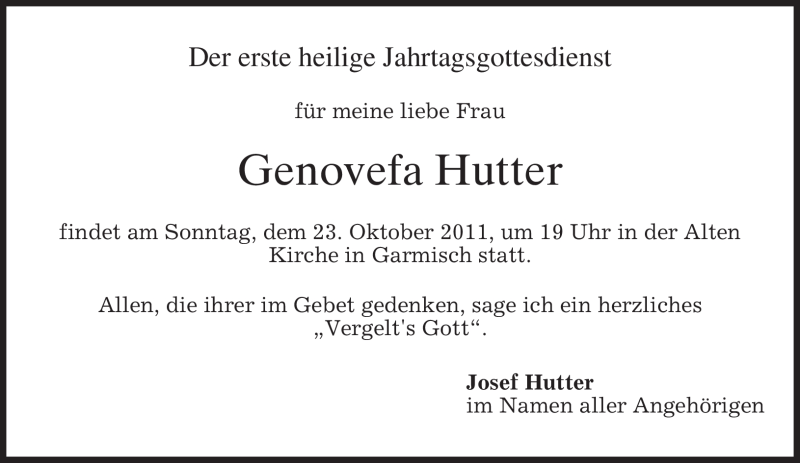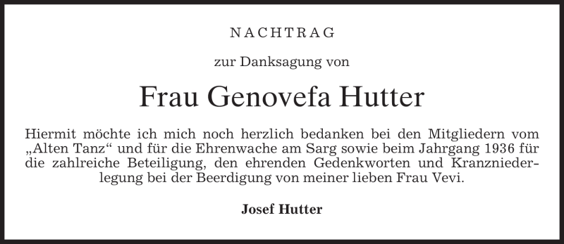 Hier finden Sie alle Traueranzeigen aus der Zeitung, die bisher für Genovefa Hutter erschienen sind. Weitere Traueranzeigen, die in der Zeitung erscheinen, werden hier ebenfalls aufgelistet