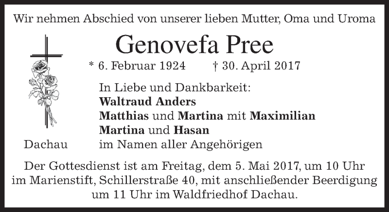Hier finden Sie alle Traueranzeigen aus der Zeitung, die bisher für Genovefa Pree erschienen sind. Weitere Traueranzeigen, die in der Zeitung erscheinen, werden hier ebenfalls aufgelistet