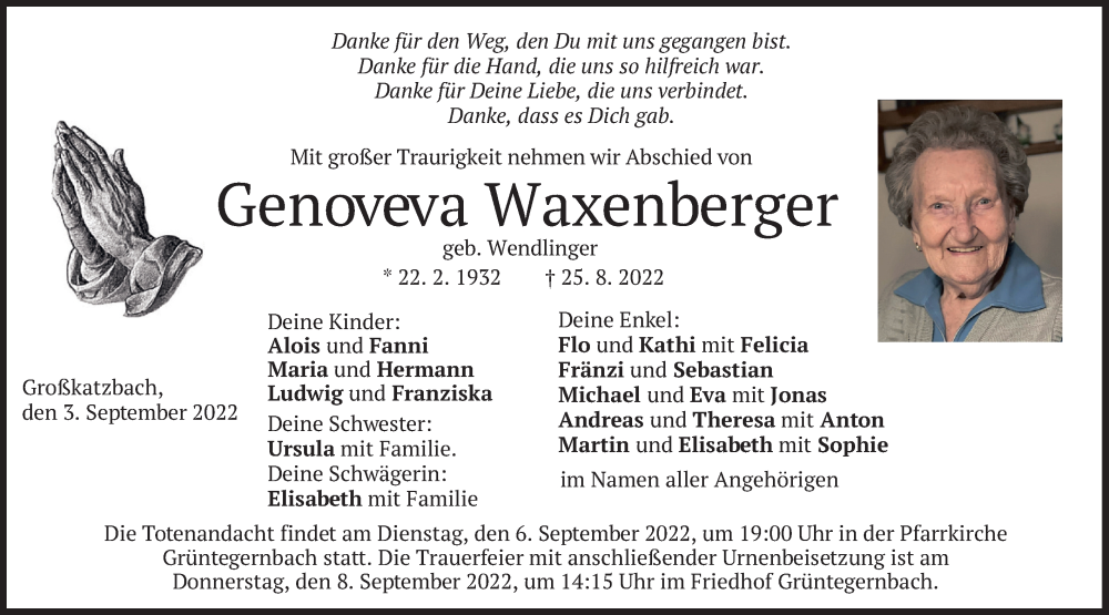 Hier finden Sie alle Traueranzeigen aus der Zeitung, die bisher für Genoveva Waxenberger erschienen sind. Weitere Traueranzeigen, die in der Zeitung erscheinen, werden hier ebenfalls aufgelistet