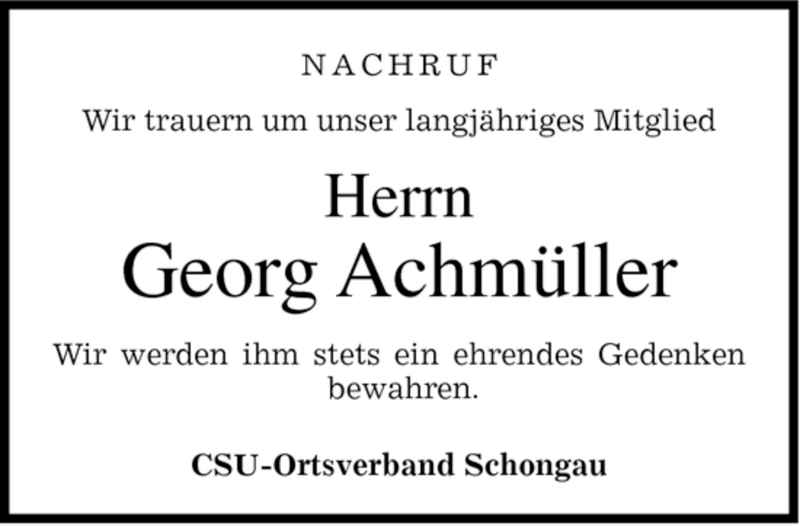 Hier finden Sie alle Traueranzeigen aus der Zeitung, die bisher für Georg Achmüller erschienen sind. Weitere Traueranzeigen, die in der Zeitung erscheinen, werden hier ebenfalls aufgelistet