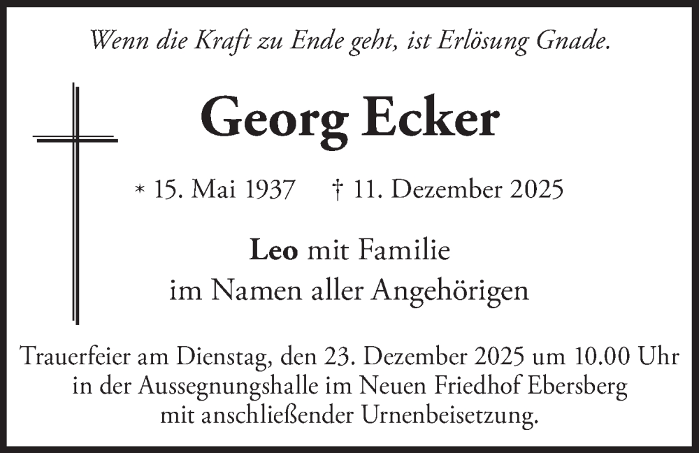 Hier finden Sie alle Traueranzeigen aus der Zeitung, die bisher für Georg Ecker erschienen sind. Weitere Traueranzeigen, die in der Zeitung erscheinen, werden hier ebenfalls aufgelistet