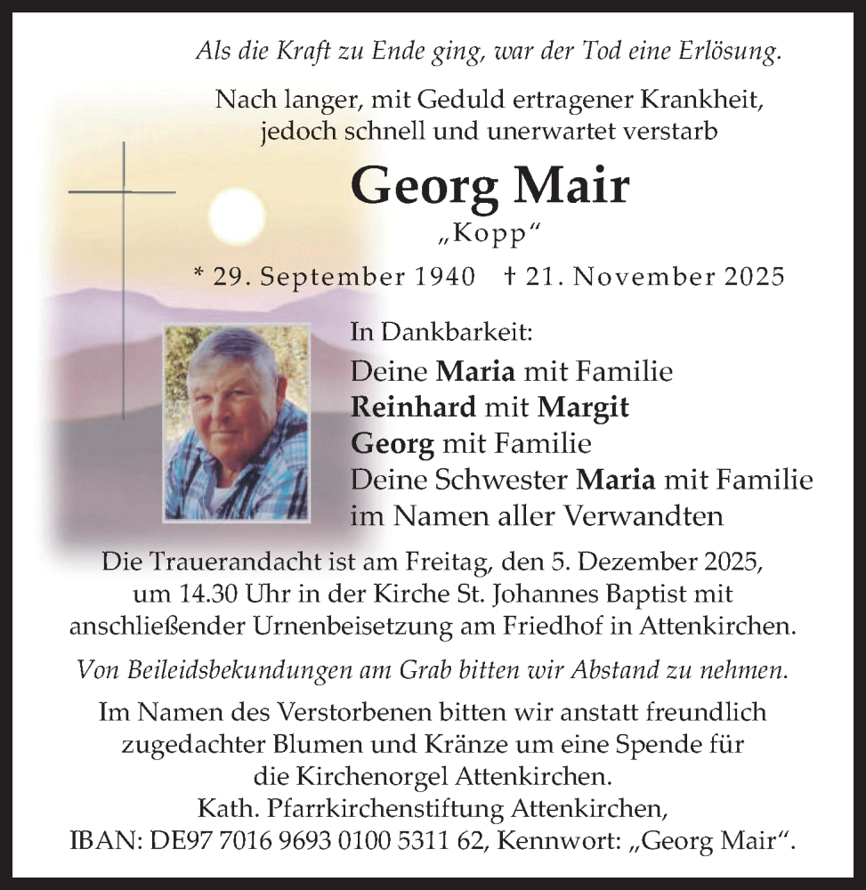 Hier finden Sie alle Traueranzeigen aus der Zeitung, die bisher für Georg Mair erschienen sind. Weitere Traueranzeigen, die in der Zeitung erscheinen, werden hier ebenfalls aufgelistet