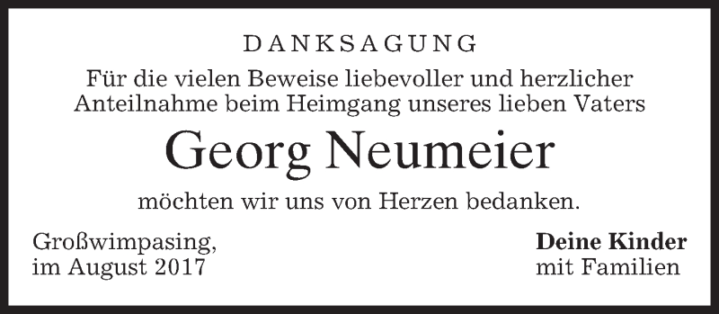 Hier finden Sie alle Traueranzeigen aus der Zeitung, die bisher für Georg Neumeier erschienen sind. Weitere Traueranzeigen, die in der Zeitung erscheinen, werden hier ebenfalls aufgelistet