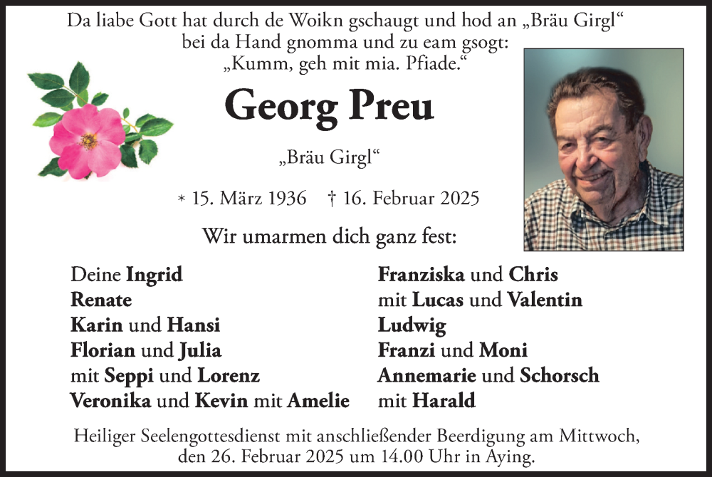 Hier finden Sie alle Traueranzeigen aus der Zeitung, die bisher für Georg Preu erschienen sind. Weitere Traueranzeigen, die in der Zeitung erscheinen, werden hier ebenfalls aufgelistet
