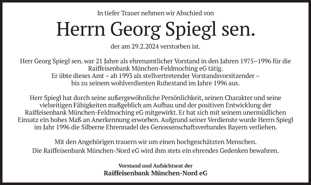 Hier finden Sie alle Traueranzeigen aus der Zeitung, die bisher für Georg Spiegl erschienen sind. Weitere Traueranzeigen, die in der Zeitung erscheinen, werden hier ebenfalls aufgelistet