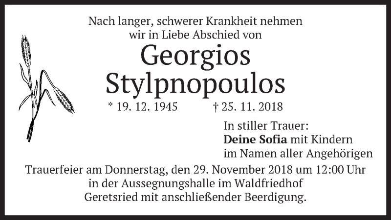 Hier finden Sie alle Traueranzeigen aus der Zeitung, die bisher für Georgios Stylpnopoulos erschienen sind. Weitere Traueranzeigen, die in der Zeitung erscheinen, werden hier ebenfalls aufgelistet