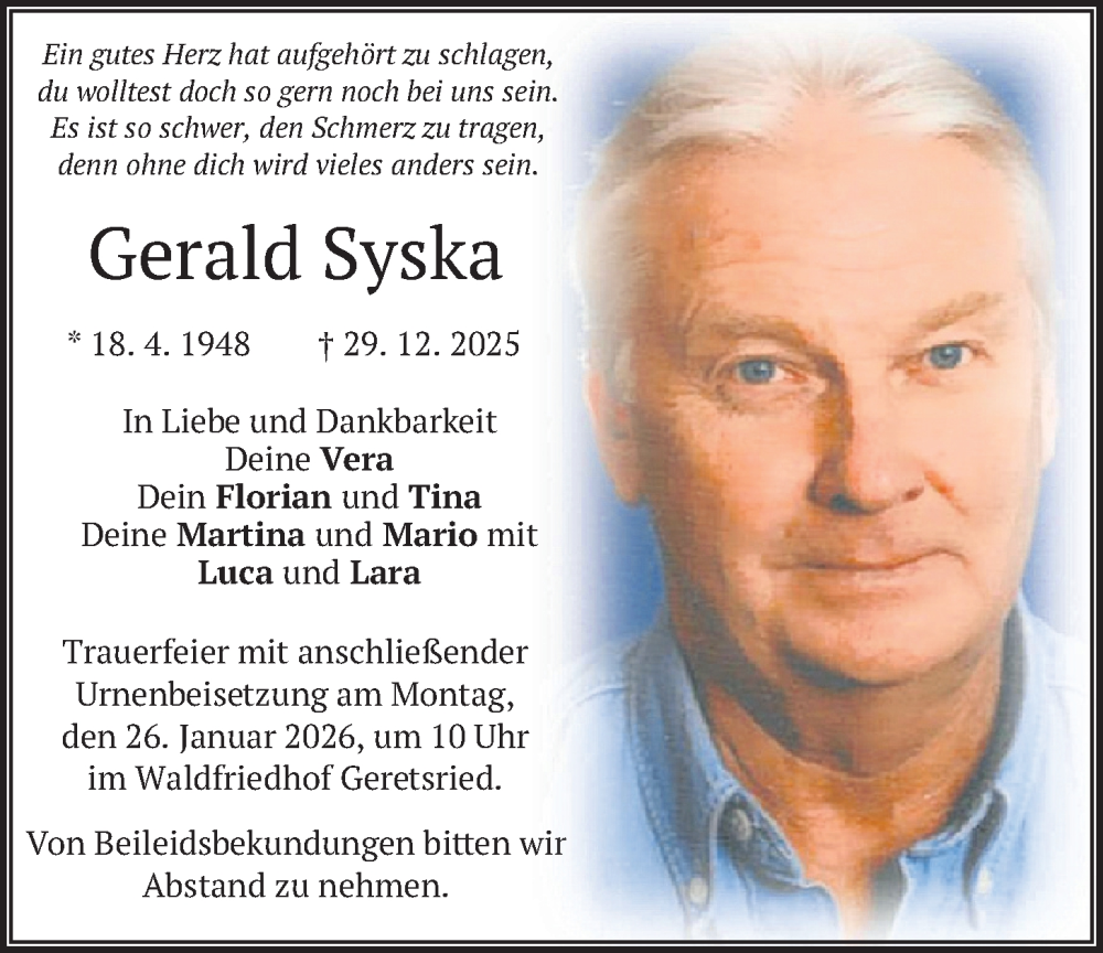 Hier finden Sie alle Traueranzeigen aus der Zeitung, die bisher für Gerald Syska erschienen sind. Weitere Traueranzeigen, die in der Zeitung erscheinen, werden hier ebenfalls aufgelistet