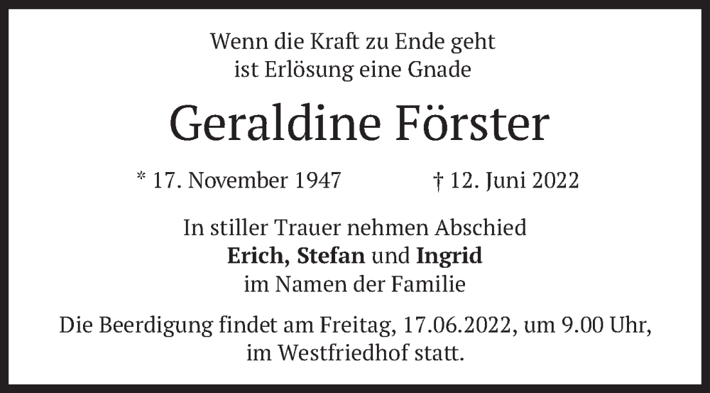 Hier finden Sie alle Traueranzeigen aus der Zeitung, die bisher für Geraldine Förster erschienen sind. Weitere Traueranzeigen, die in der Zeitung erscheinen, werden hier ebenfalls aufgelistet