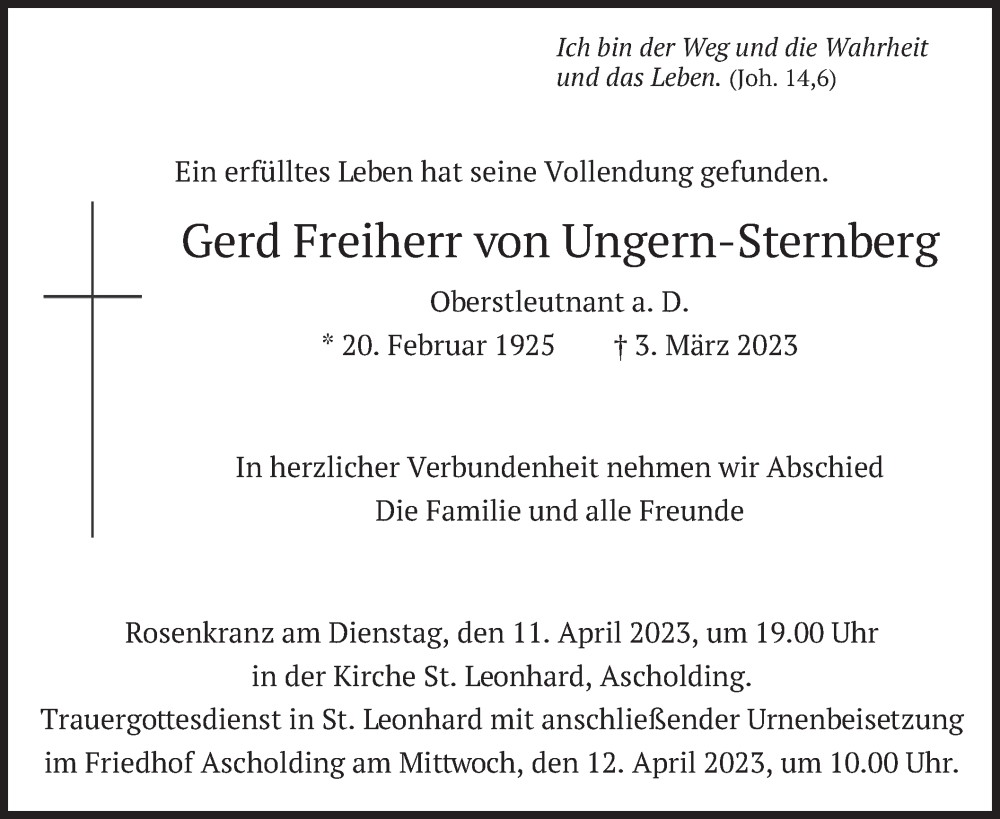 Hier finden Sie alle Traueranzeigen aus der Zeitung, die bisher für Gerd Freiherr von Ungern-Sternberg erschienen sind. Weitere Traueranzeigen, die in der Zeitung erscheinen, werden hier ebenfalls aufgelistet