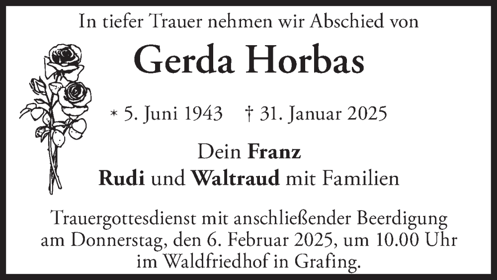 Hier finden Sie alle Traueranzeigen aus der Zeitung, die bisher für Gerda Horbas erschienen sind. Weitere Traueranzeigen, die in der Zeitung erscheinen, werden hier ebenfalls aufgelistet
