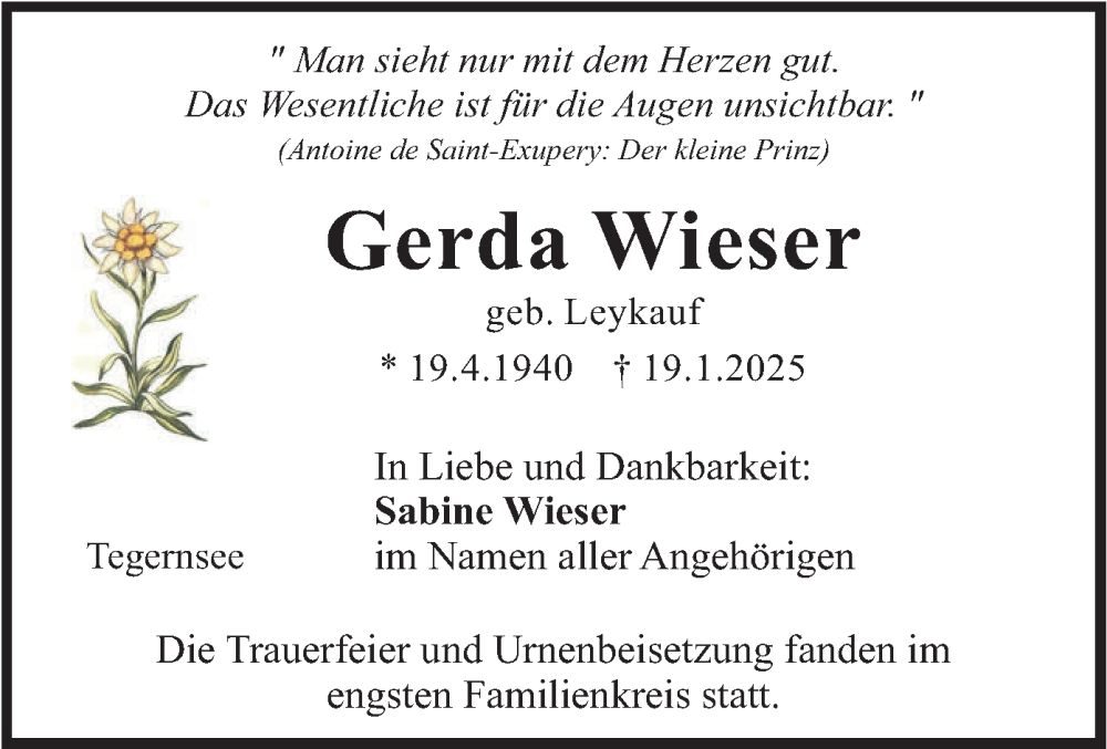 Hier finden Sie alle Traueranzeigen aus der Zeitung, die bisher für Gerda Wieser erschienen sind. Weitere Traueranzeigen, die in der Zeitung erscheinen, werden hier ebenfalls aufgelistet