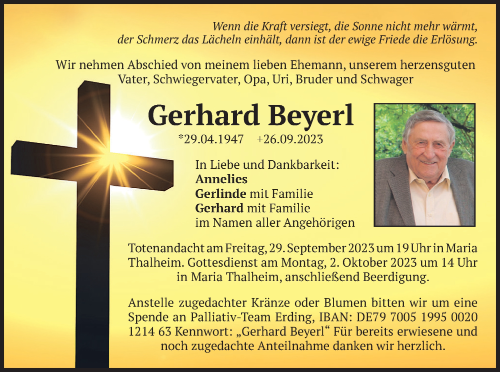 Hier finden Sie alle Traueranzeigen aus der Zeitung, die bisher für Gerhard Beyerl erschienen sind. Weitere Traueranzeigen, die in der Zeitung erscheinen, werden hier ebenfalls aufgelistet