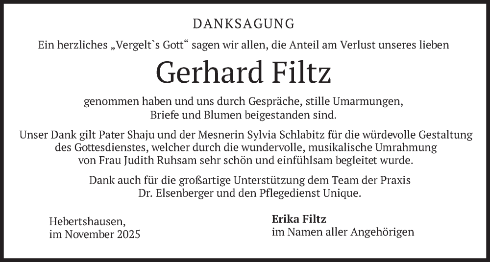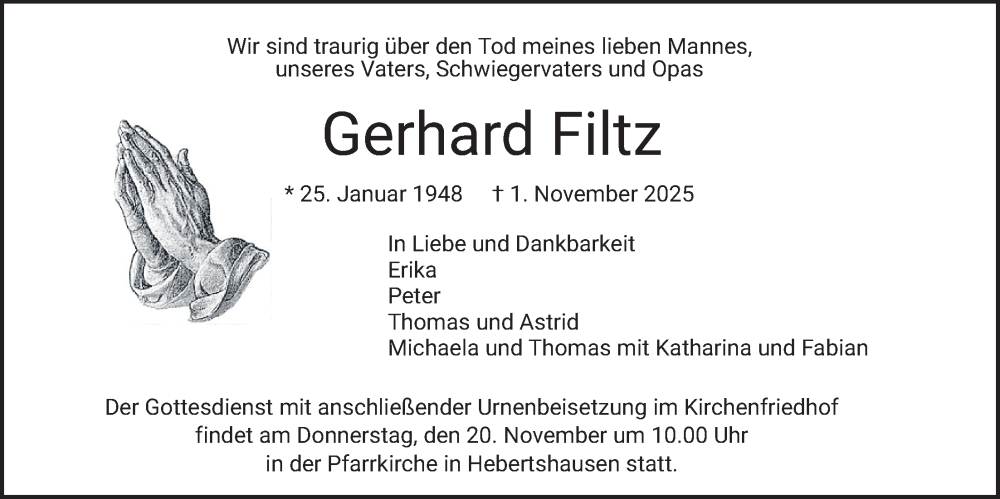 Hier finden Sie alle Traueranzeigen aus der Zeitung, die bisher für Gerhard Filtz erschienen sind. Weitere Traueranzeigen, die in der Zeitung erscheinen, werden hier ebenfalls aufgelistet
