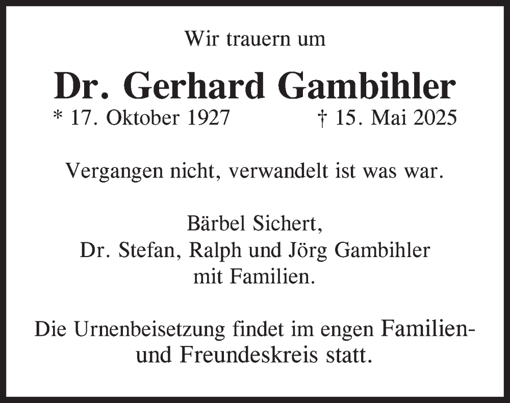 Hier finden Sie alle Traueranzeigen aus der Zeitung, die bisher für Gerhard Gambihler erschienen sind. Weitere Traueranzeigen, die in der Zeitung erscheinen, werden hier ebenfalls aufgelistet
