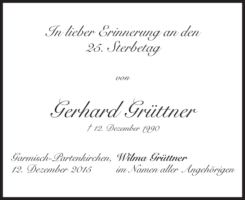 Hier finden Sie alle Traueranzeigen aus der Zeitung, die bisher für Gerhard Grüttner erschienen sind. Weitere Traueranzeigen, die in der Zeitung erscheinen, werden hier ebenfalls aufgelistet