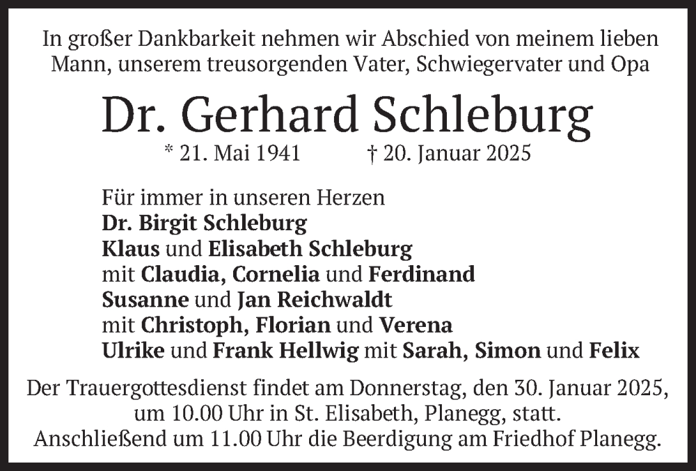 Hier finden Sie alle Traueranzeigen aus der Zeitung, die bisher für Gerhard Schleburg erschienen sind. Weitere Traueranzeigen, die in der Zeitung erscheinen, werden hier ebenfalls aufgelistet