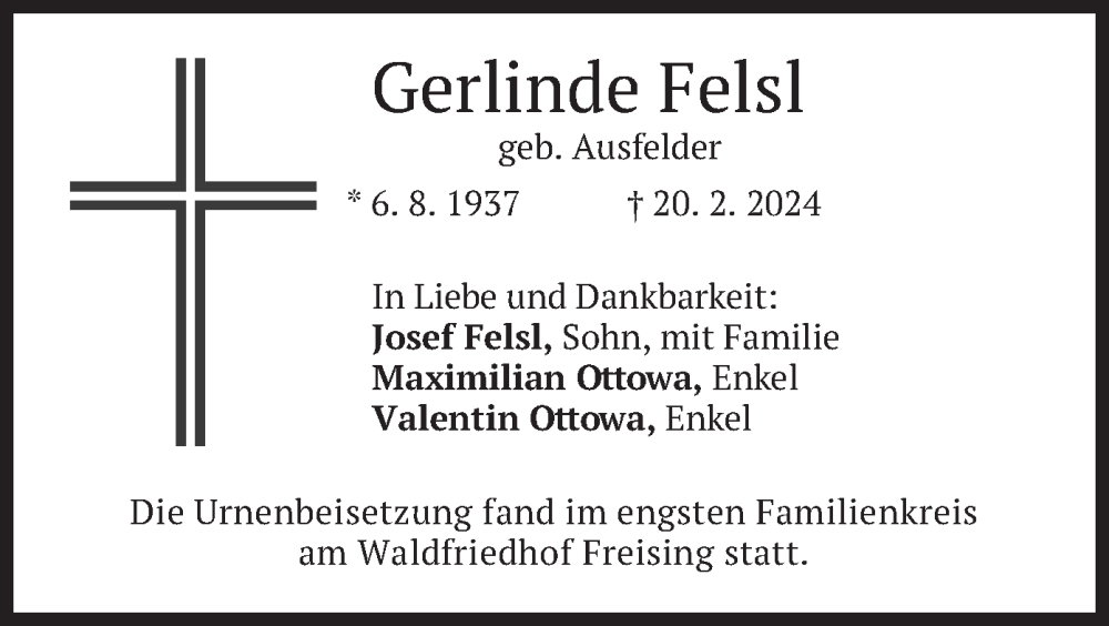 Hier finden Sie alle Traueranzeigen aus der Zeitung, die bisher für Gerlinde Felsl erschienen sind. Weitere Traueranzeigen, die in der Zeitung erscheinen, werden hier ebenfalls aufgelistet