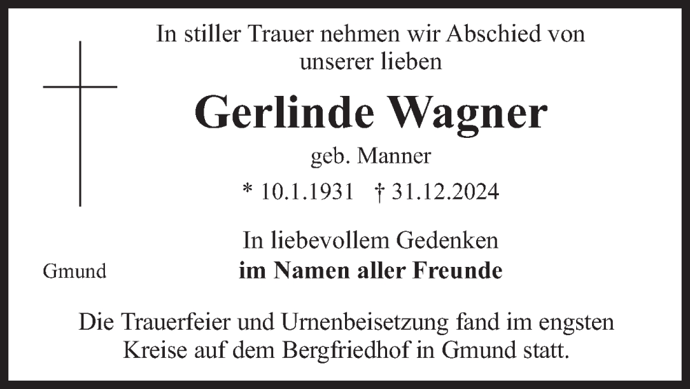 Hier finden Sie alle Traueranzeigen aus der Zeitung, die bisher für Gerlinde Wagner erschienen sind. Weitere Traueranzeigen, die in der Zeitung erscheinen, werden hier ebenfalls aufgelistet