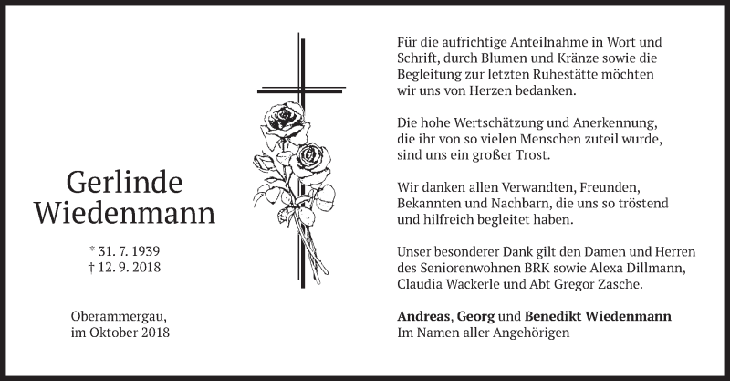 Hier finden Sie alle Traueranzeigen aus der Zeitung, die bisher für Gerlinde Wiedenmann erschienen sind. Weitere Traueranzeigen, die in der Zeitung erscheinen, werden hier ebenfalls aufgelistet