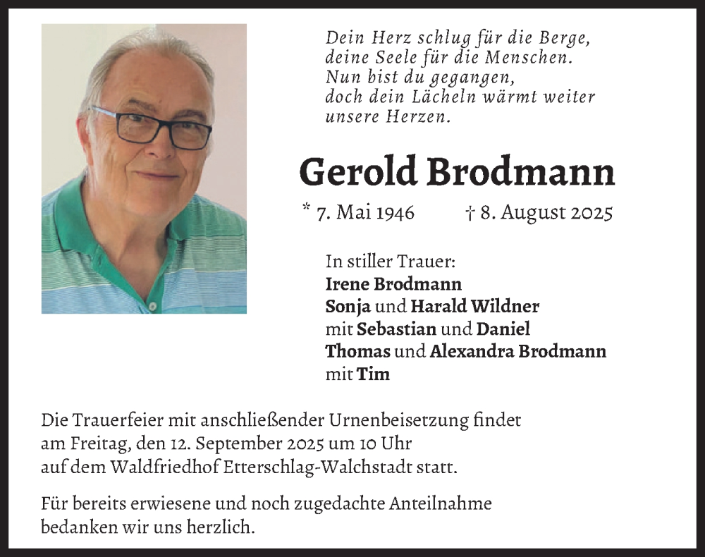 Hier finden Sie alle Traueranzeigen aus der Zeitung, die bisher für Gerold Brodmann erschienen sind. Weitere Traueranzeigen, die in der Zeitung erscheinen, werden hier ebenfalls aufgelistet
