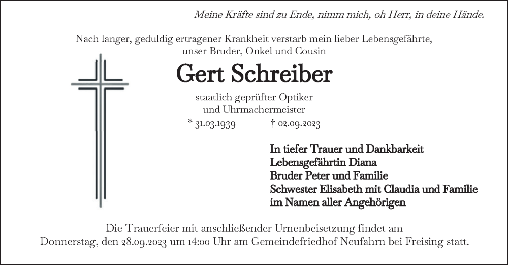 Hier finden Sie alle Traueranzeigen aus der Zeitung, die bisher für Gert Schreiber erschienen sind. Weitere Traueranzeigen, die in der Zeitung erscheinen, werden hier ebenfalls aufgelistet