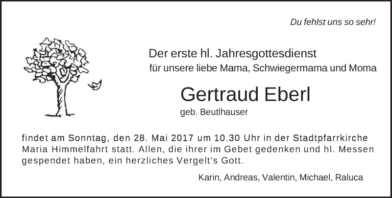 Hier finden Sie alle Traueranzeigen aus der Zeitung, die bisher für Gertraud Eberl erschienen sind. Weitere Traueranzeigen, die in der Zeitung erscheinen, werden hier ebenfalls aufgelistet