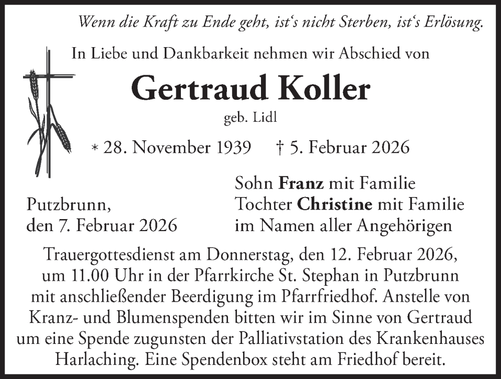 Hier finden Sie alle Traueranzeigen aus der Zeitung, die bisher für Gertraud Koller erschienen sind. Weitere Traueranzeigen, die in der Zeitung erscheinen, werden hier ebenfalls aufgelistet