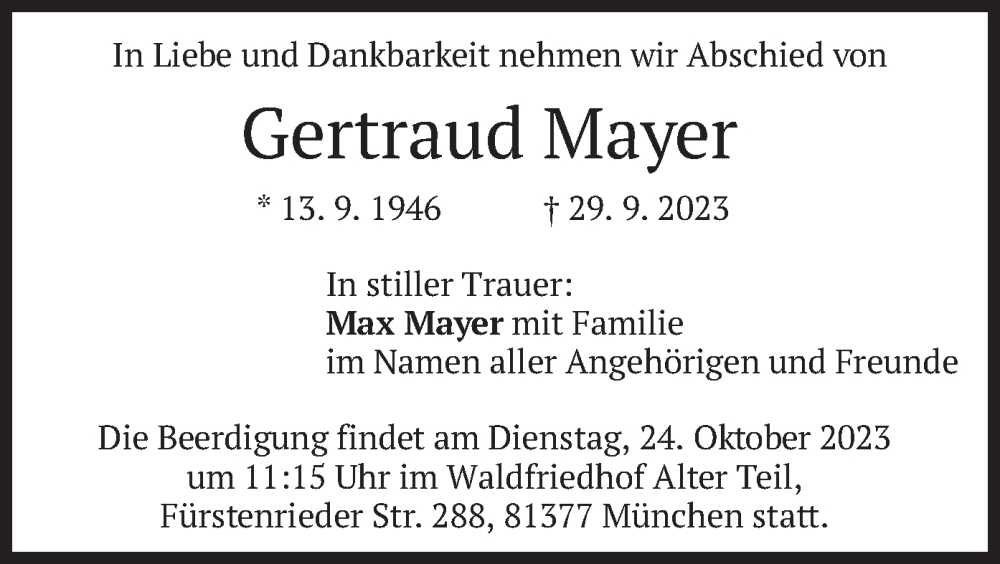 Hier finden Sie alle Traueranzeigen aus der Zeitung, die bisher für Gertraud Mayer erschienen sind. Weitere Traueranzeigen, die in der Zeitung erscheinen, werden hier ebenfalls aufgelistet