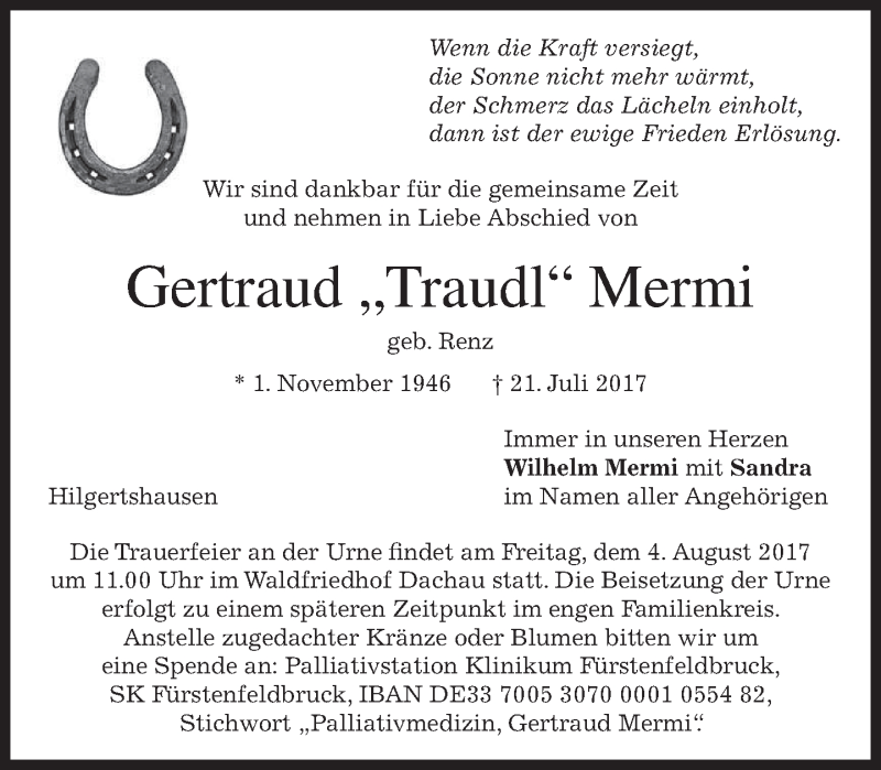 Hier finden Sie alle Traueranzeigen aus der Zeitung, die bisher für Gertraud Mermi erschienen sind. Weitere Traueranzeigen, die in der Zeitung erscheinen, werden hier ebenfalls aufgelistet